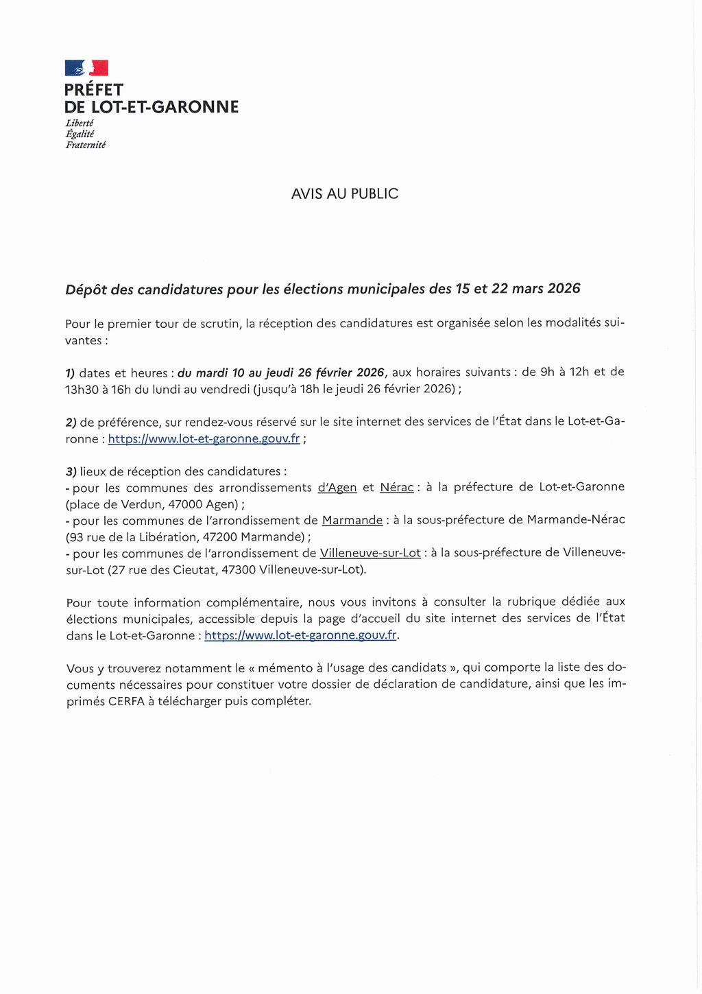 Dépôt des candidatures pour les élections municipales des 15 et 22 mars 2026